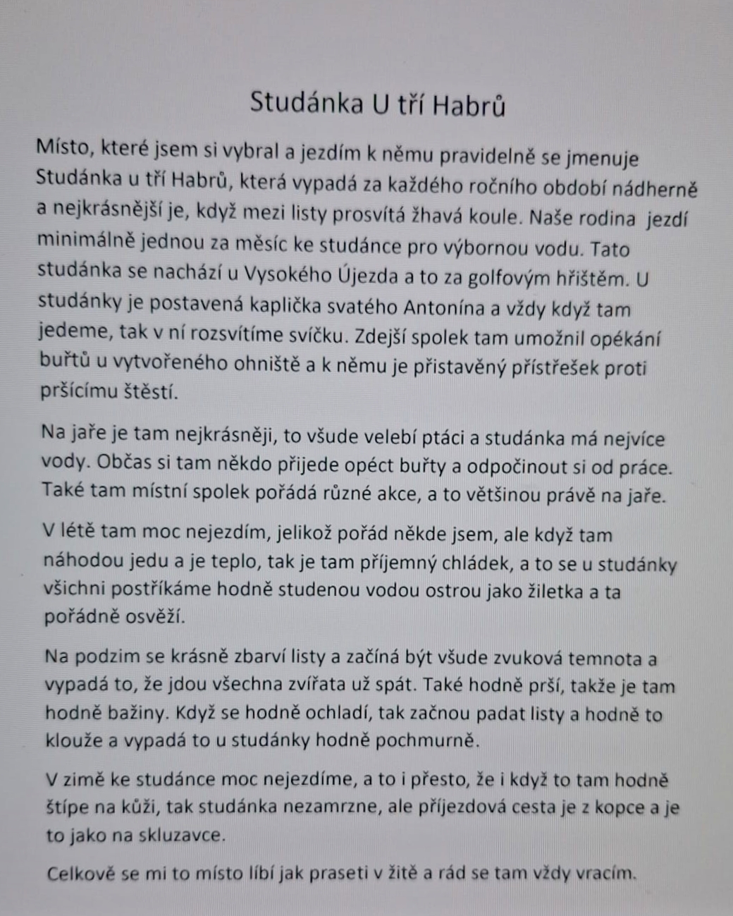Čas letí jako bláznivý… se zpívá ve známé populární písni. Než jsme se pořádně nadechli, máme za sebou další kalendářní rok. U studánky se mimo běžných akcí podařilo díky finanční dotaci obce Vysoký Újezd opravit svod vody a vybudovat pěkné jezírko. Překvapil nás velmi zájem o vodní hrátky především menších návštěvníků. Zvolené podloží dlouho odolávalo kamenům a klackům. Až nakonec plachta povolila. Bude třeba nádržku opravit. Všímavým zrakům neuniklo nové zábradlí za lavičkou. Stále platí, že je místo hojně navštěvované a voda z pramene U Tří habrů oblíbená. Čerstvé testování z října 2023 její kvalitu znovu potvrdilo. Dovolte mi v závěru roku poděkovat za vaši přízeň a těšíme se na vás při Poslední lesní schůzi. Bude se konat v tradičním termínu 30.12.2023 ve 13:00. Krásné Vánoce a pohodový vstup do nového roku 2024.